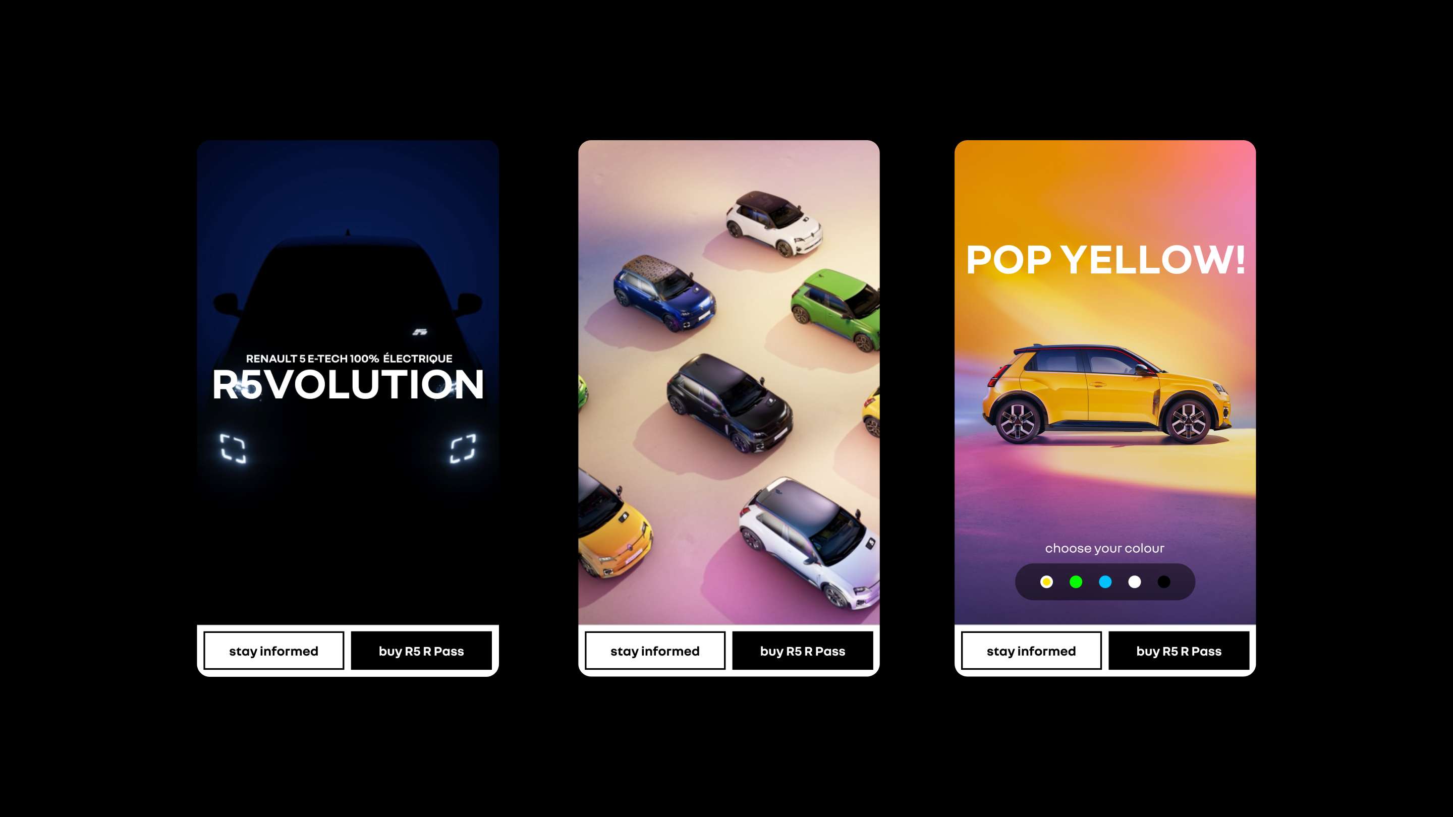 Le design de R5 n’a été révélé que lors de son lancement, le 26 février 2024, créant ainsi un véritable événement. Nous avons alors lancé une campagne cross-platform intégrée, comprenant media online, panneaux interactifs et du « story-scrolling digital » permettant aux utilisateurs de découvrir les différentes couleurs de la Renault 5. Réseaux sociaux et activations terrain ont ensuite continué à booster sa visibilité durant tout le printemps et l’été 2024.